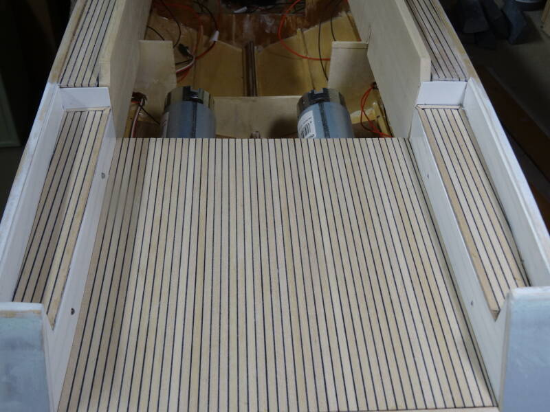 Plancher arrière : réalisation du plancher en lamellé collé. Le plancher est amovible pour accéder au système de commande des gouvernails.